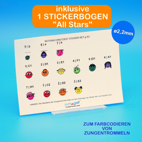 In Kombination mit den lustigen Notenschnutzies-Stickern für die Zungentrommel entsteht ein ganz besonderes, spielerisch leichtes Musikerlebnis, das vor allem Kindern den Zugang zur Musik auf intuitive Weise eröffnet.
