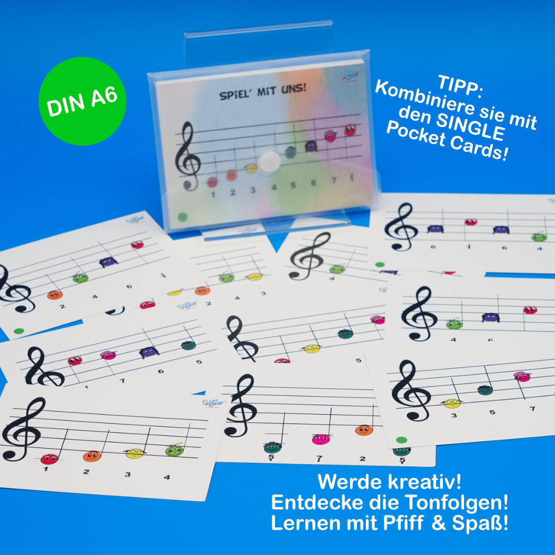 Damit kannst du jederzeit eine kleine Melodie spielen und das Spielen z. B. auf deiner Zungentrommel, aber auch anderen Instrumenten verbessern! Außerdem kannst du dir eigene kleine Melodiefolgen bauen, indem du mehrere Karten nebeneinander legst und immer wieder austauschst.
